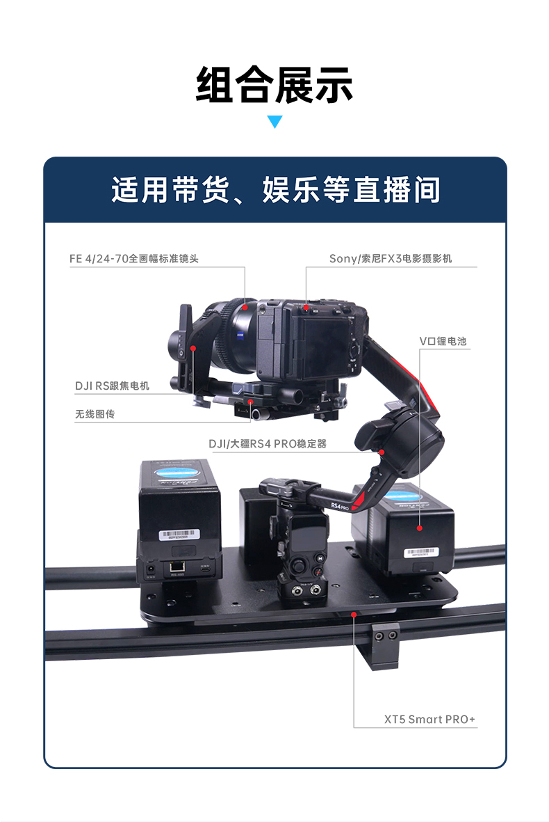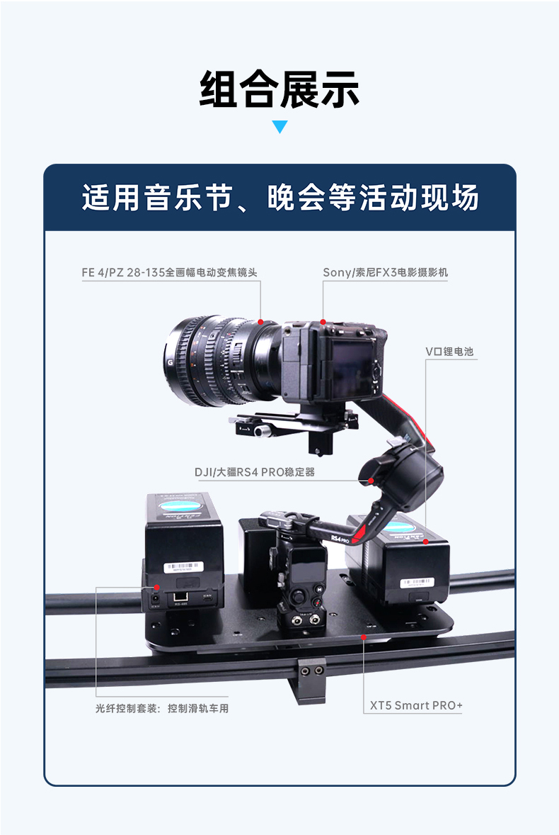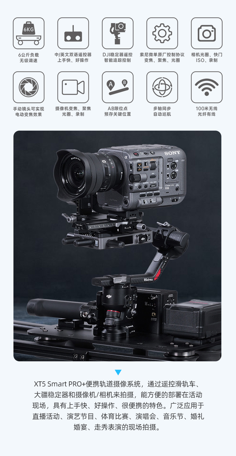 XT5 smart 是一款便携型遥控轨道摄像系统,通过远程遥控滑轨车、大疆稳定器和摄像机/相机来拍摄,具有上手快、好操作、很便携的特色。 广泛应用于活动现场、演艺表演、体育比赛、演唱会、音乐节、综艺真人秀等场景的拍摄。
